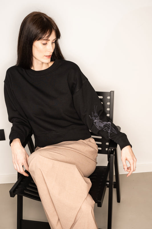 Kratek črn pulover s kobilico v sivi barvi na roki