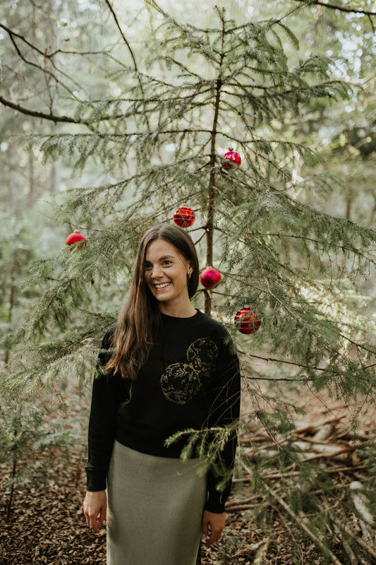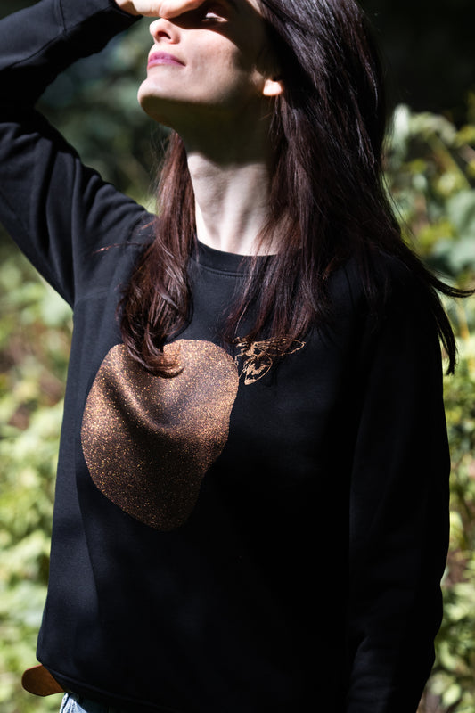Kratek črn pulover z zlatimi bučkami v telesu žužka